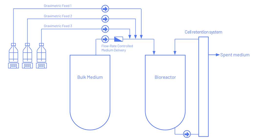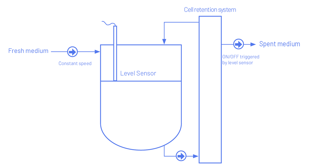 Figure 2: Continuous media exchange maintains a stable environment for the proliferating and differentiating cells. A cell retention system keeps the cells within the bioreactor, while the medium is continuously renewed, removing metabolic by-products and supplying fresh nutrients.