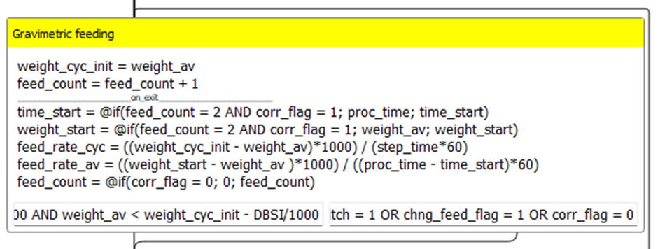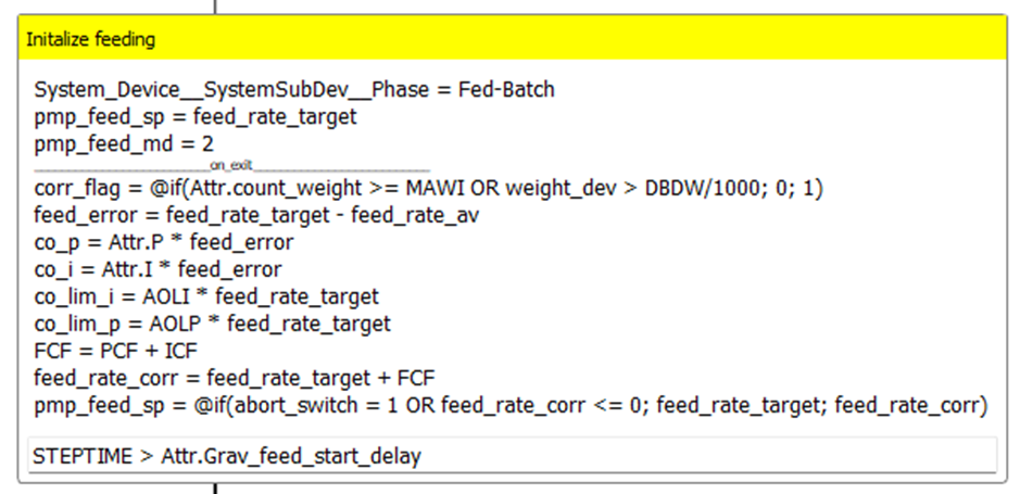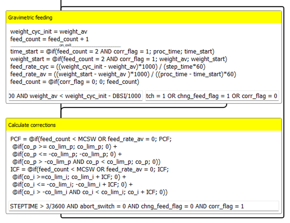 Figure 9: in the Step “Gravimetric feeding”, the parameter feed_count is incremented each feed cycle (feed_count = feed_count +1), unless parameter corr_flag is 0. If such is the case, feed_count is reset to 0 (feed_count - @if(corr_flag = 0; 0; feed_count)). This typically happens as a result of an unplanned disturbance of the feed weight, a planned bottle exchange, or a planned change of the feed rate target. Once corr_flag changes from 0 back to a value of 1, feed_count will start incrementing again. When it has reached a value of 2, the start weight will acquire a new value, based on the current calculated averaged feed weight (weight_start = @if(feed_count = 2 AND corr_flag = 1; weight_av; weight_start)). During the next feed cycle, gravimetric corrections are then resumed.