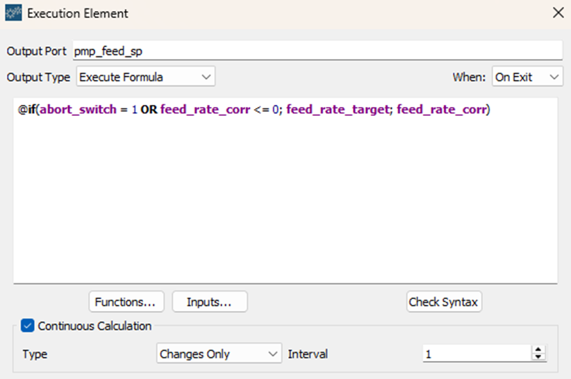 Figure 7: Control logic for the feed pump regulation. An equation was defined for the setpoint of the feed pump (parameter pmp_feed_sp). The equation is executed continuously by Lucullus®, which means that if any of the components in the equation acquires a new value, the equation is automatically re-calculated. The equation contains a conditional statement, which allows the value of either parameter feed_rate_corr or feed_rate_target to be assigned to the pump setpoint. Parameter feed_rate_corr is the calculated end result of the gravimetric corrections and is assigned to pmp_feed_sp under ideal conditions. When conditions are not ideal, the value of feed_rate_target is assigned to pmp_feed_sp instead. The latter can happen automatically (value of feed_rate_corr 0 or lower) or by intervention of the operator, by assigning a value of 1 to parameter abort_switch.