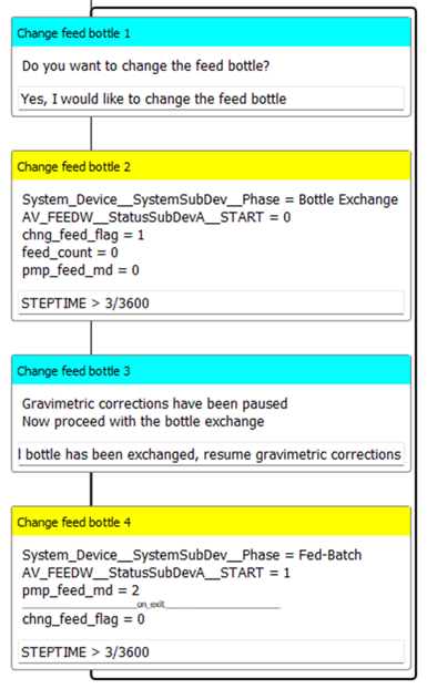 Figure 10: The branch in the Parallel Block of the Operation responsible for dealing with a bottle exchange. The blue Steps indicate so-called Manual Steps, i.e., Steps dedicated to interactions with the Operator. Upon execution of the first Step, Lucullus® asks the operator to confirm that the bottle needs to be exchanged. When this has happened, Lucullus® stops the feed pump (pmp_feed_md = 0), resets gravimetric corrections (feed_count = 0), and freezes the feed cycle by assigning a value of 1 to parameter chng_feed_flag. The third Step is then executed, and Lucullus® asks the operator to confirm that the bottle has been exchanged. When this has happened, Lucullus® restarts the feed pump and un-freezes the feed cycle by assigning a value of 0 to chng_feed_flag. At this point, Lucullus® makes a fresh start applying the gravimetric corrections. At the same time, the last Step in this branch loops back to the first Step and waits for the Operator to notify Lucullus® of another bottle exchange at a later time.