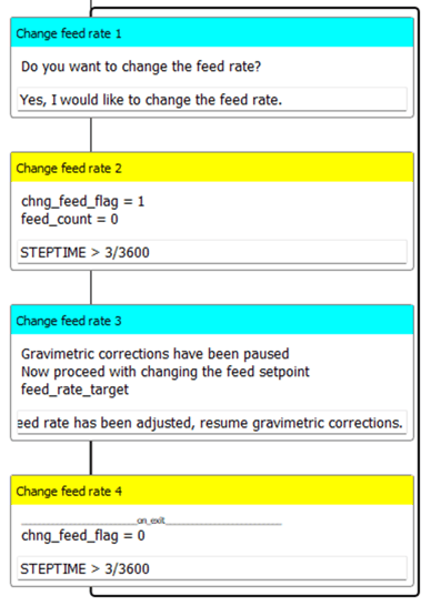 Figure 11: The branch in the Parallel Block of the Operation responsible for dealing with a change of the target feed rate. The blue Steps indicate so-called Manual Steps, i.e. Steps dedicated to interactions with the Operator. Upon execution of the first Step, Lucullus® asks the operator to confirm that the target feed rate needs to be changed. When this has happened, Lucullus® resets gravimetric corrections (feed_count = 0) and freezes the feed cycle by assigning a value of 1 to parameter chng_feed_flag. The third Step is then executed, and Lucullus® asks the operator to confirm that the target feed rate has been changed. When this has happened, Lucullus® un-freezes the feed cycle by assigning a value of 0 to chng_feed_flag. At this point, Lucullus® makes a fresh start applying the gravimetric corrections. At the same time, the last Step in this branch loops back to the first Step and waits for the Operator to notify Lucullus® of another change of the target feed rate at a later time.