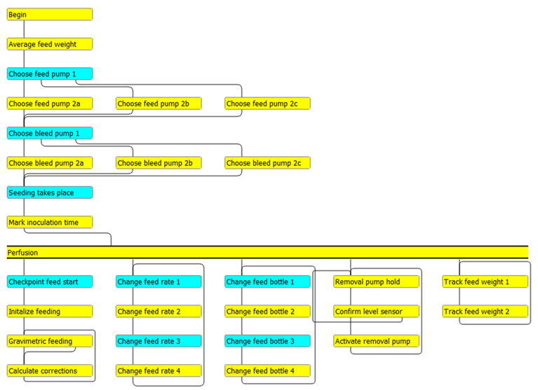 Figure 12: Overview of the final version of the complete gravimetric feed Operation. Steps with yellow headers are executed automatically by Lucullus®, whereas those with blue headers require an input from the operator before Lucullus® can proceed to the next Step. On top of the Step Chain, the blue colored Steps “Choose feed pump” and “Choose bleed pump” allow the operator to select for both the feed and bleed pumps one particular pump out of a selection of three available pumps, providing extra flexibility to the user (the different pumps have different capacities). When the operator has confirmed inoculation, Lucullus proceeds to the Parallel Block called “Perfusion” and then executes the 5 branches in that Parallel Block simultaneously. From left to right these branches have the following functions: executing feeding and gravimetric corrections, changing the target feed rate, exchanging the feed bottle, removing excess liquid (bleed) and tracking the progression of the feed weight on the balance.
