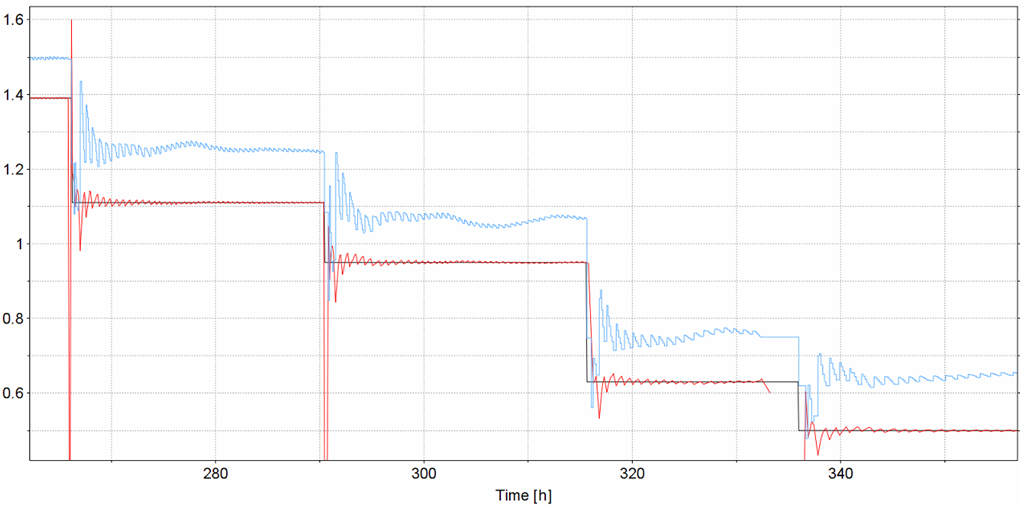 Figure 13: Performance of the gravimetric feed correction algorithm for cultivation “Run A”. During the execution of this run relatively low target feed rates were employed, ranging between 0.46 – 1.40 g/min. The horizontal axis indicates the time [h] since the start of the process in Lucullus®, the vertical axis indicates the feed rate [g/min]. Three parameters are plotted in this graph: the target feed rate (black curve), the actual (averaged) feed rate (red curve), and the setpoint for the feed pump (blue curve). During this cultivation the feed setpoint was first increased two times, and at a later stage decreased four times. In addition, several feed bottle exchanges took place during the period the cultivation was at the highest feed rate. The red and blue curves show fluctuations after each feed bottle exchange / setpoint change, which diminish over time, with the red curve eventually fully overlapping the black curve. Note the constantly changing offset between the target feed rate and the feed pump setpoint, clearly indicating the need to do gravimetric corrections in order to feed sufficiently accurate.