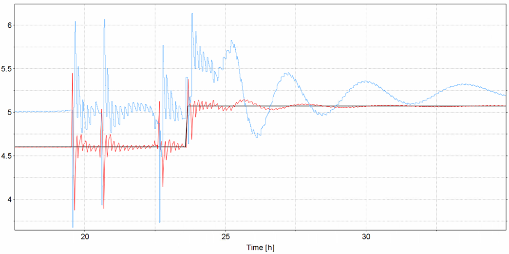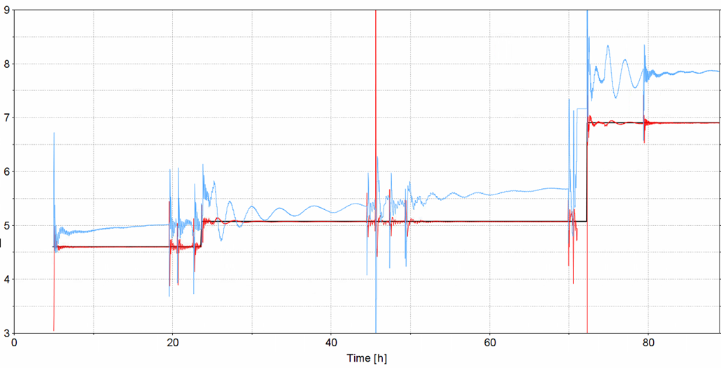 However, in the case of Safi, the equipment available (balances with a relatively low accuracy of 5 g) made it impossible to effectively implement the same strategy for applying gravimetric corrections, as in prior cases. The principle applied in these cases was to correct the rate of the feed pump directly at a relatively high frequency, by calculating the actual feed rate based on two consecutive balance measurements and using the error (difference with the desired feed rate) to correct the feed pump setpoint.